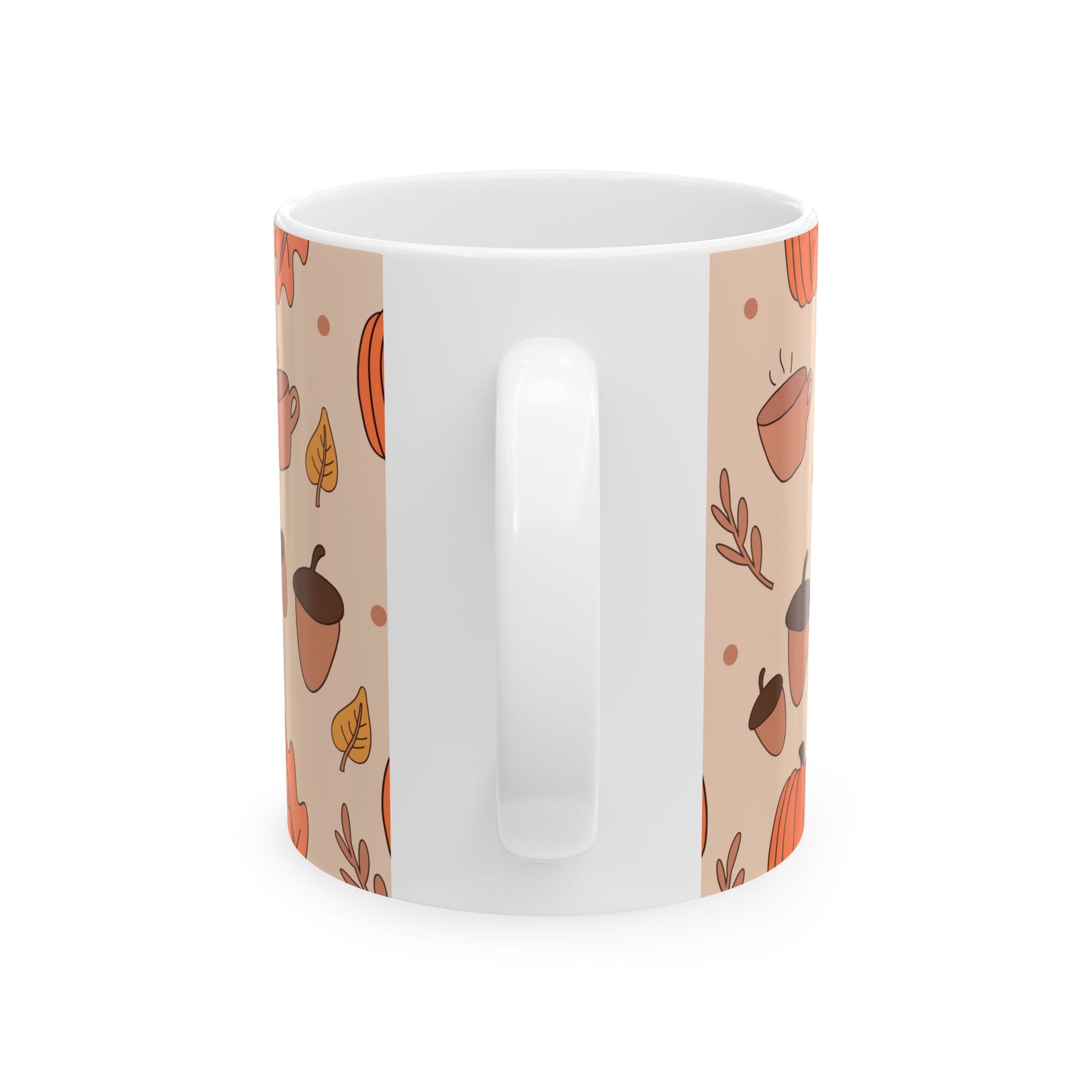 Warmth in your hands and an afternoon of crunchy leaves. This glossy ceramic mug wraps a gentle autumn pattern — pumpkins, acorns, steaming cups, and scattered leaves — in soft terracotta and beige tones. It feels like the first sip of a spiced latte while the world outside turns orange. Dishwasher- and microwave-safe, the design stays bright through daily use. The comfortable C-handle and two size options mean this mug slips easily into morning routines, cozy reading nooks, or a slow-savored break between tasks. Lead- and BPA-free, it’s made to be used and loved every day.